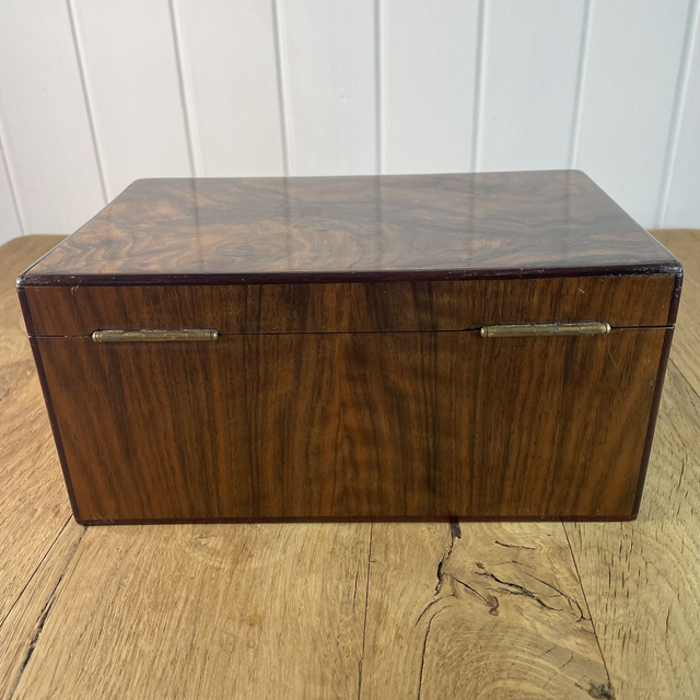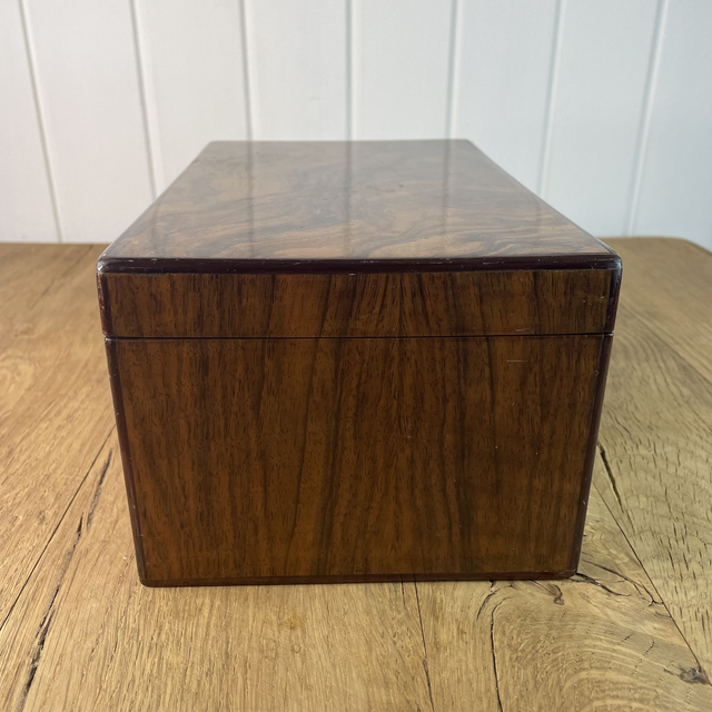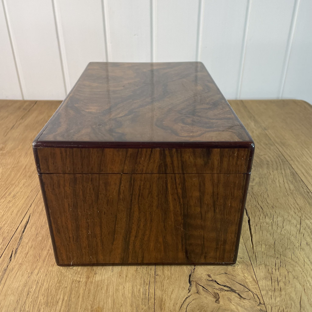 Boîte en différentes essences de bois (couvercle en placage de loupe de frêne ou d'olivier, extérieur en noyer ou acacia).
