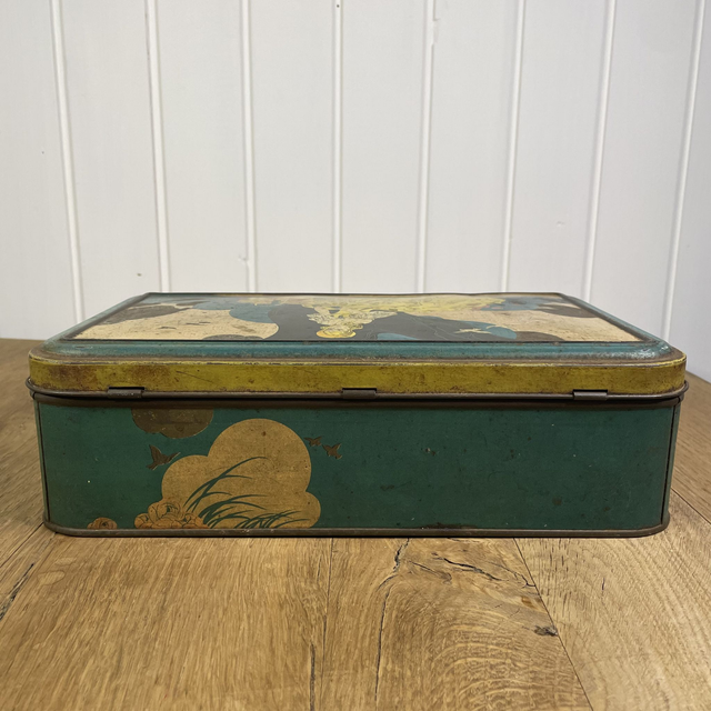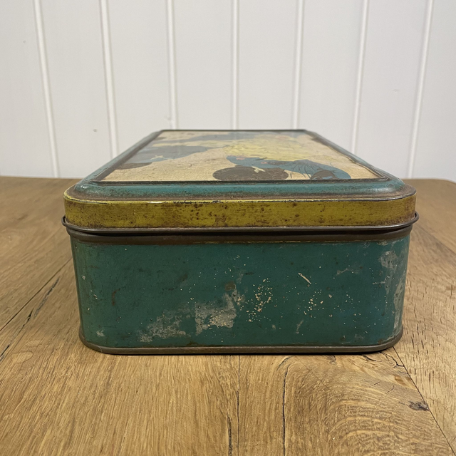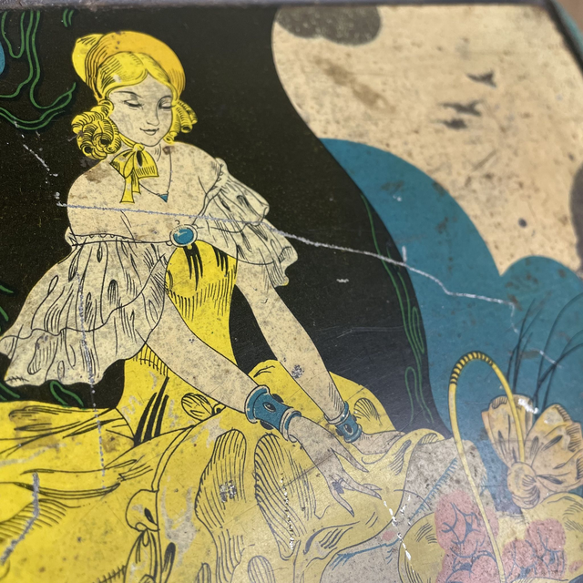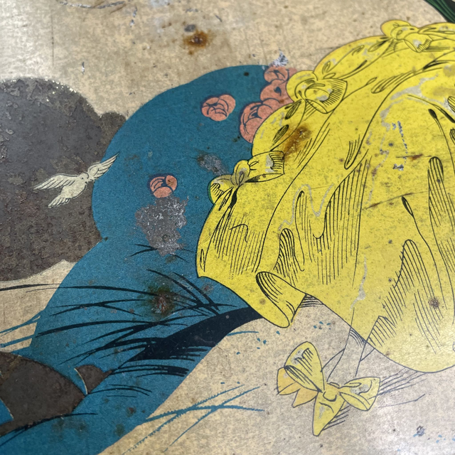 Grande boîte Jeune fille au Panier de Roses dans les tons bleu et jaune.