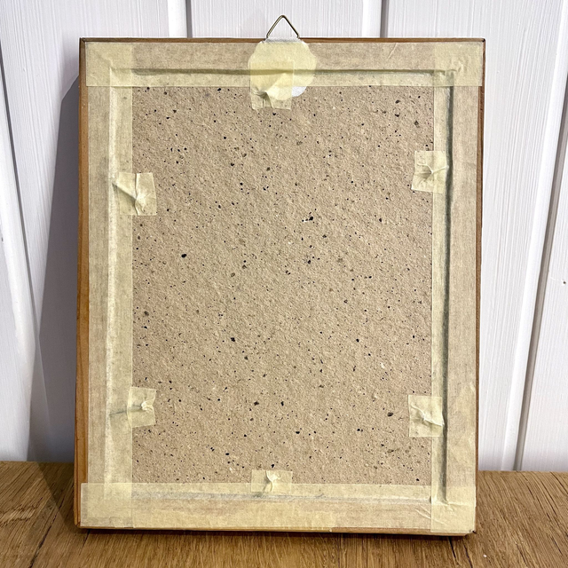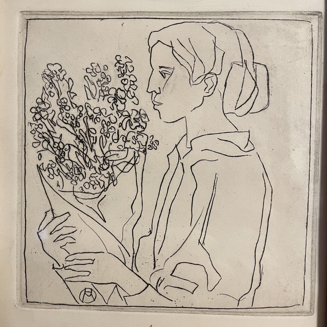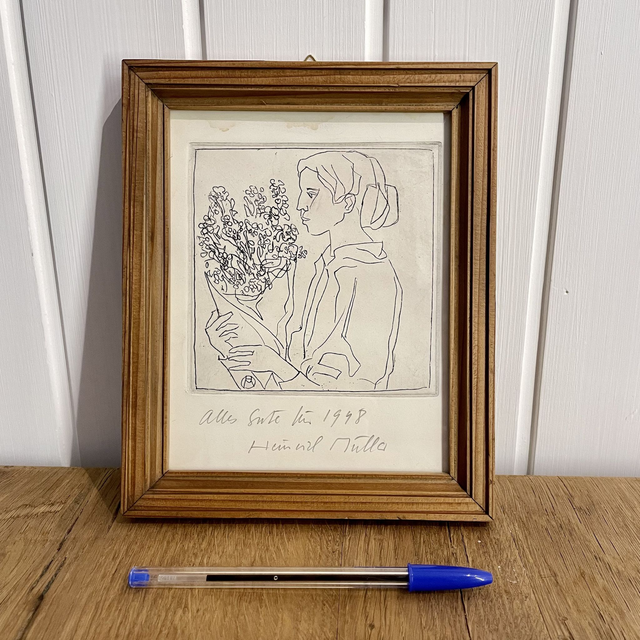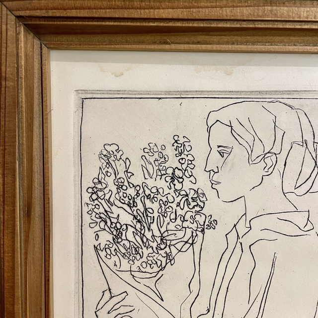 Jolie gravure (cf. relief papier) d'un dessin d'une jeune femme au bouquet dans un cadre en bois.