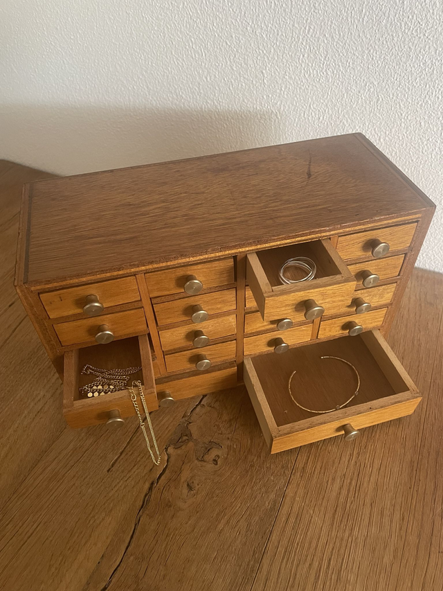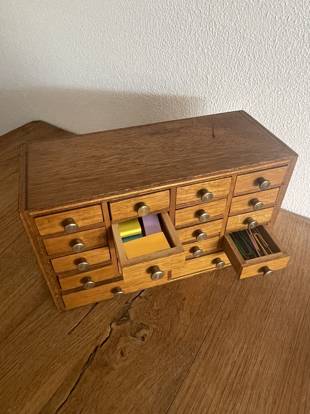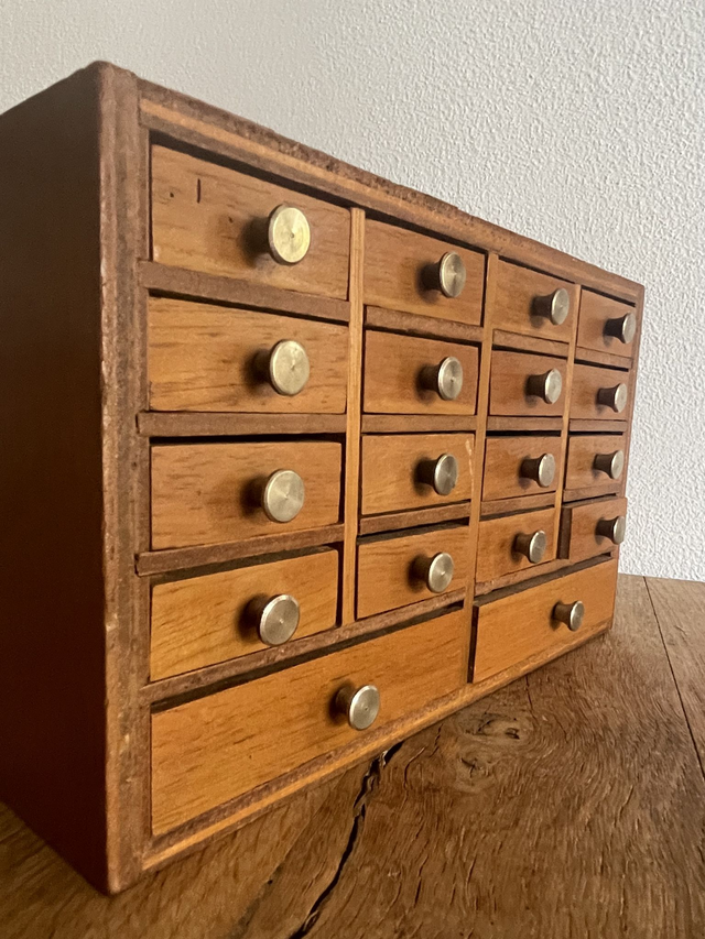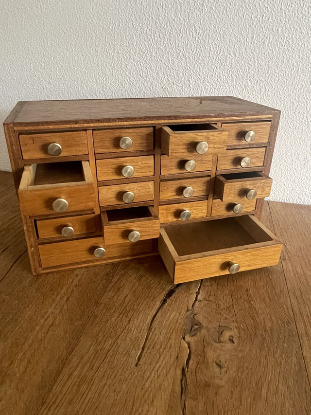 Equipée de nombreux petits tiroirs (18 tiroirs) avec leurs boutons d’origine en laiton.