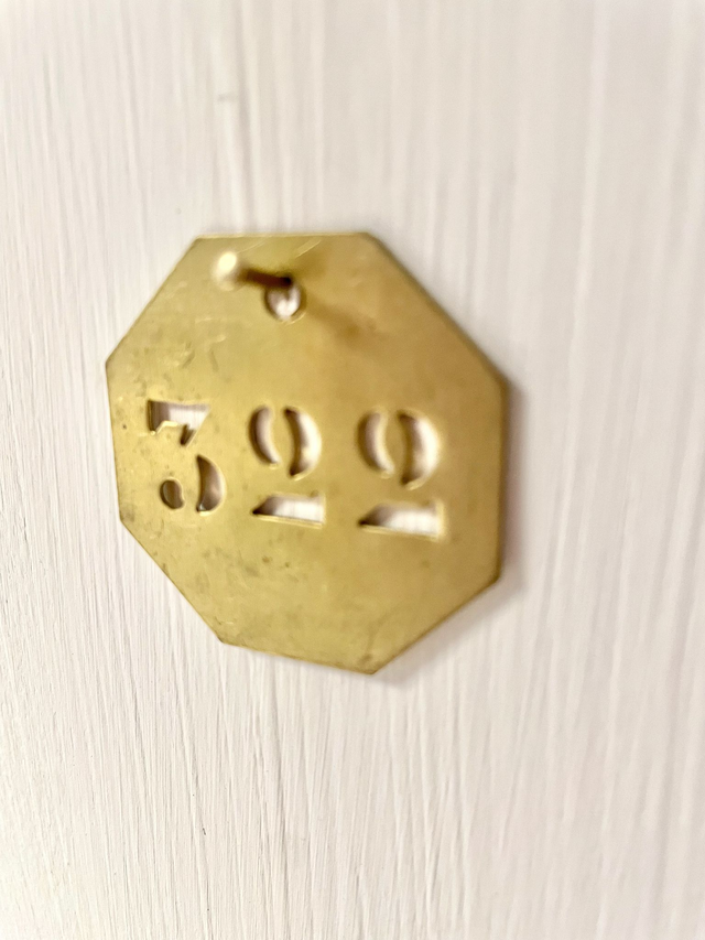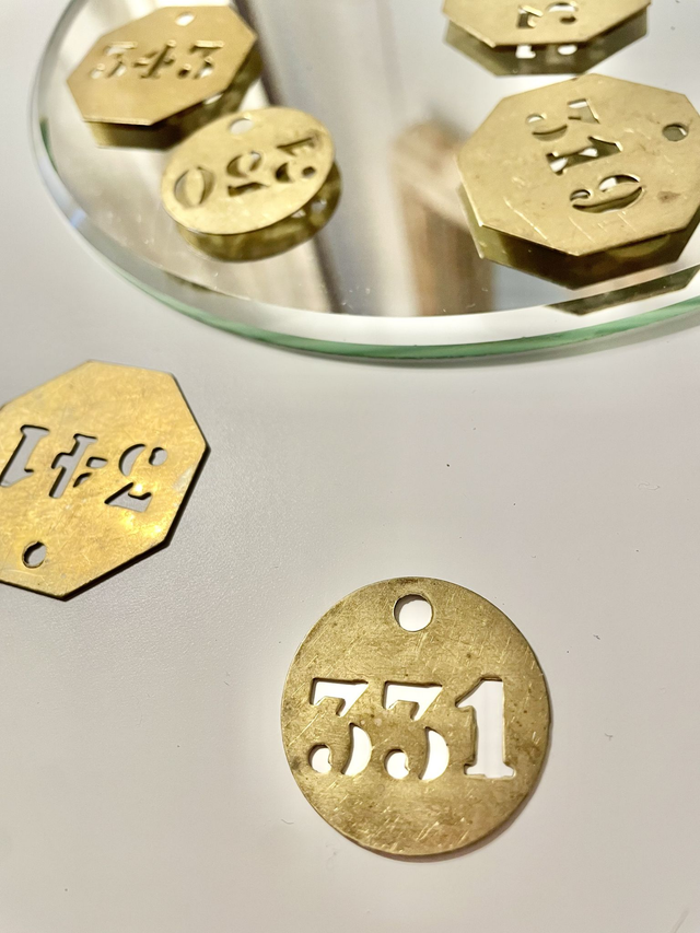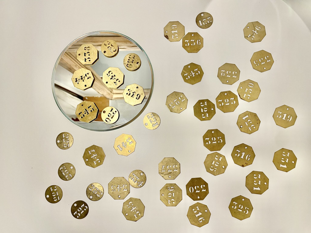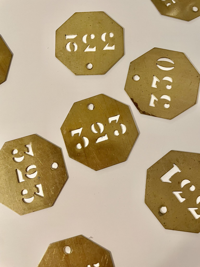 Lot de 3 plaques en laiton avec numéro découpé de forme octogonale.
