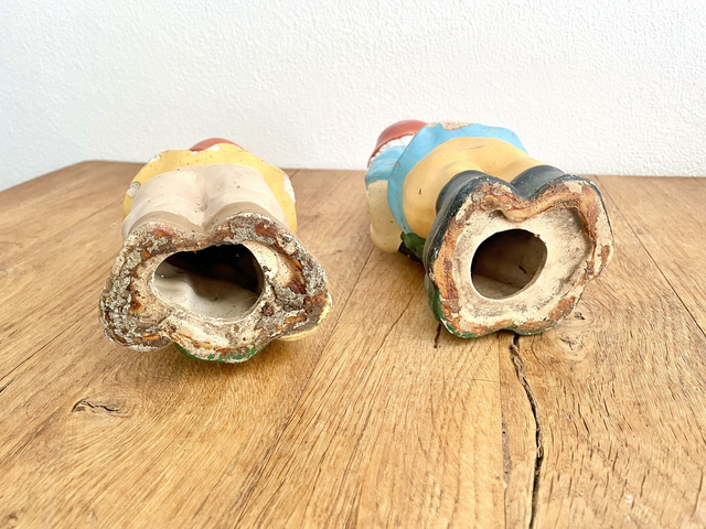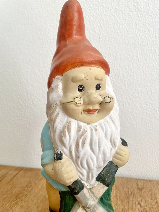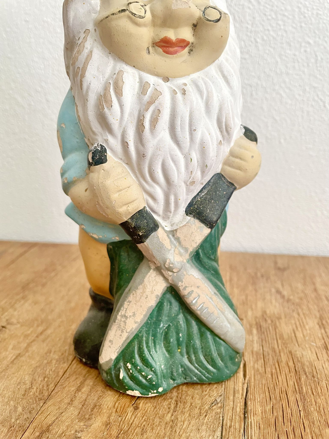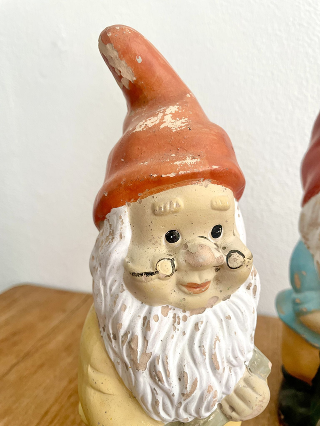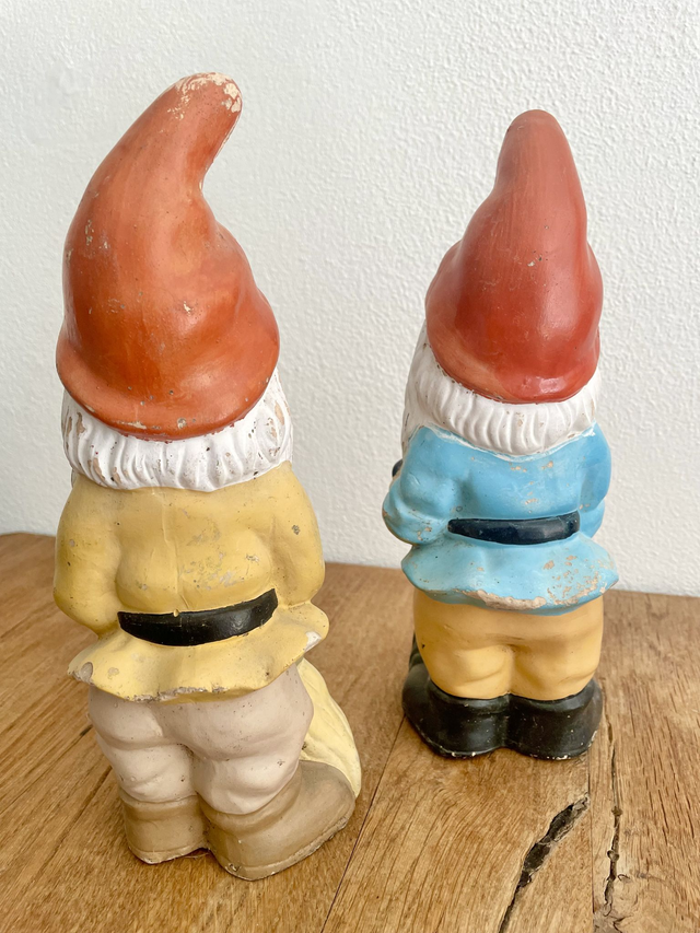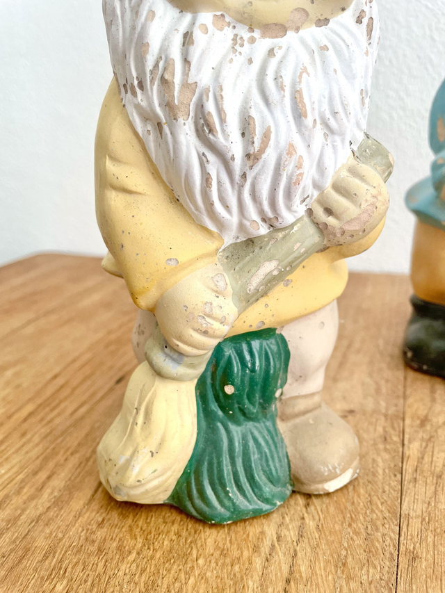 Un adorable binôme de nains de jardins datant des années 1960, l'un muni d'un balai, l'autre d'une cisaille.